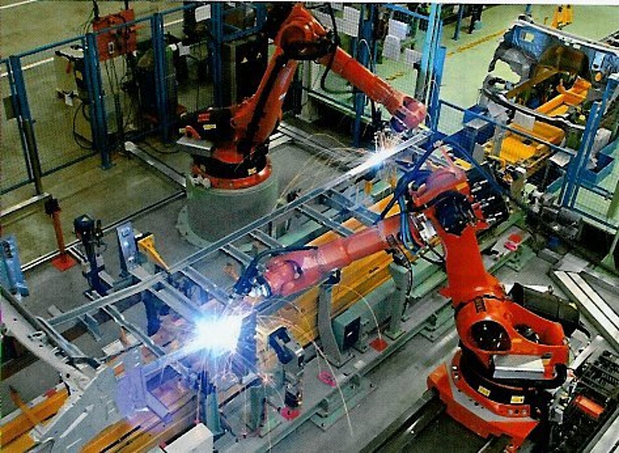 Unser Rundgang startete in der Rohbau – Halle, die aus Platzgründen im Gegensatz zu üblichen Bauweisen in die Höhe gebaut wurde und über zwei Montage – und zwei Zwischenebenen verfügt. Es existieren zahlreiche Aufzüge, die die Karosserien zwischen den beiden Arbeitsebenen befördern. Die Schweißarbeiten werden durchweg von Industrierobotern ausgeführt, die Tätigkeit der Mitarbeiter beschränkt sich auf die Bereitstellung der Teile zu Beginn des Prozesses und auf die Qualitätskontrolle. Durch Einsatz des Metall – Aktivgas – Schweißverfahrens wird der Funkenflug reduziert und der Lichtbogen besser geschützt.