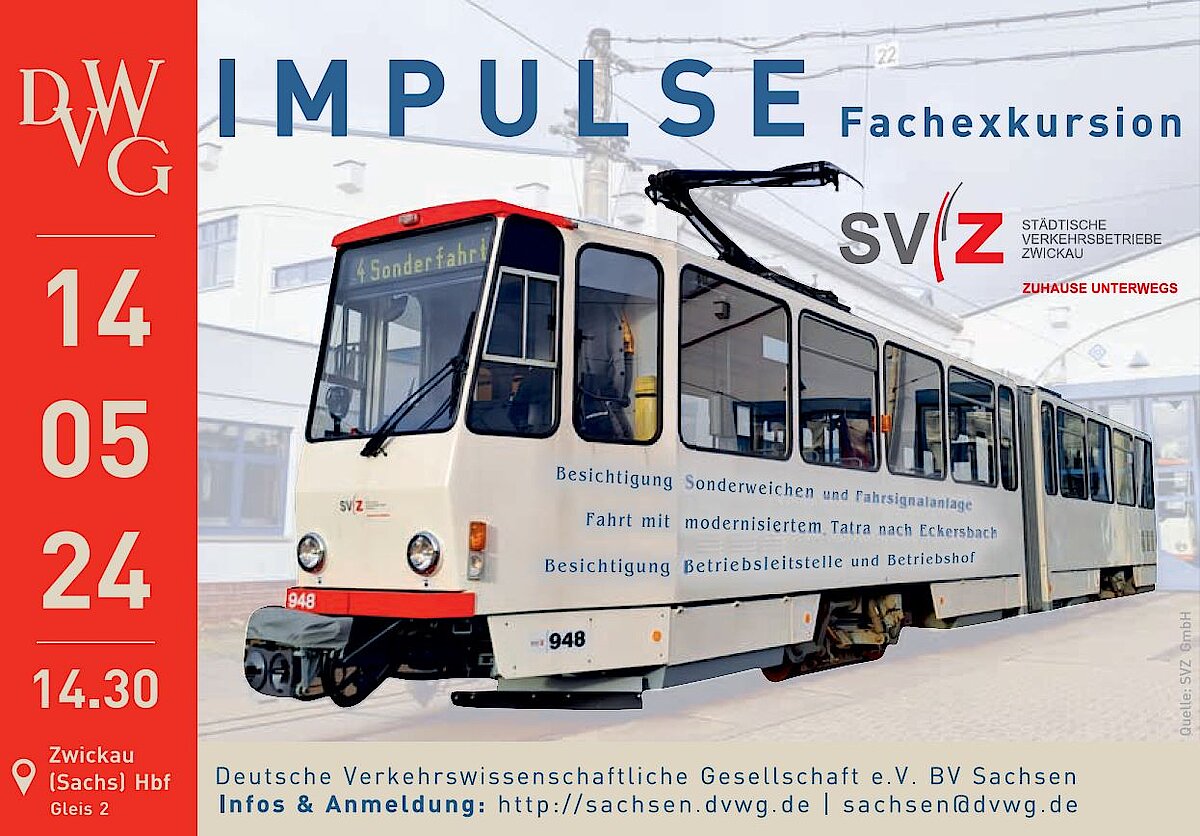 am 14. Mai 2024 findet in Kooperation mit den Städtischen Verkehrsbetrieben Zwickau GmbH (SVZ) eine Fachexkursion statt. Um 14.30 Uhr begrüßt uns Dr. Steffen Schranil, Betriebsleiter BO Strab und Ableitungsleiter Technik bei der SVZ GmbH, am Hauptbahnhof Zwickau direkt am Gleis 2. In den folgenden knapp vier Stunden dürfen Sie sich auf ein fantastisches Rahmenprogramm freuen, Highlight ist u.a. die Fahrt mit einer modernisiertem Tatra nach Eckersbach. Den detaillierten Programmablauf finden Sie hier. Für Teilnehmer aus Dresden bietet sich eine Anreise mit dem RE 3 um 12.52 Uhr ab Dresden Hauptbahnhof (Gl.10) an.