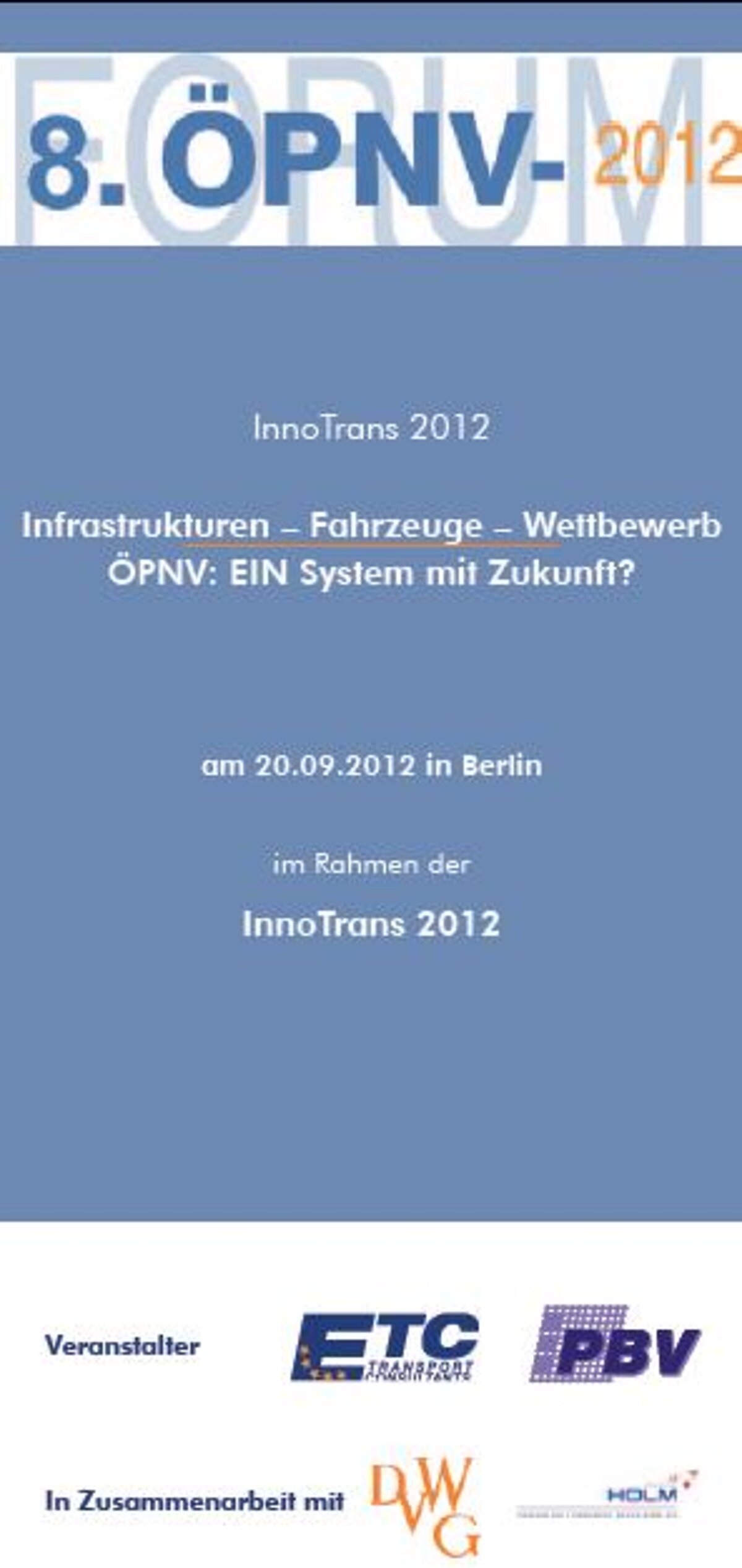 Die Veranstaltung wird seit 1998 von den Unternehmen ETC Transport Consultants GmbH und PBV Planungsbüro für Verkehr in Zusammenarbeit mit der Deutschen Verkehrswissenschaftlichen Gesellschaft e.V. durchgeführt. Das traditionsreiche Forum nimmt in diesem Jahr die Perspektiven des öffentlichen Verkehrs im komplexen Beziehungsdreieck zwischen Infrastruktur, Fahrzeug und Wettbewerb in den Blick. Dabei gliedert sich die Veranstaltung in zwei Teile. Im ersten Teil werden in ausgewählten Impulsreferaten die grundlegenden inhaltlichen Aspekte der Thematik abgesteckt. In einem zweiten Teil erfolgt im Forumstalk eine offene Diskussion der aufgezeigten Schwerpunkt.