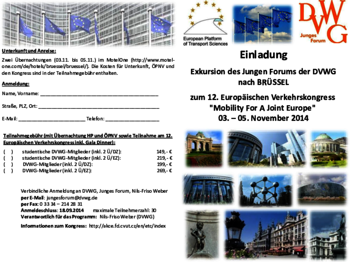 auch in diesem Jahr führt das Junge Forum wieder eine Exkursion zum Europäischen Verkehrskongress durch. In diesem Jahr findet dieser in der Zeit vom 03.11. bis zum 05.11.2014 in Brüssel statt. Den Ablauf der <link fileadmin content-pool junges_forum flyer-bruessel-nov2014_01.pdf download der datei>Exkursion und das <link fileadmin content-pool junges_forum etc_2014_registration.pdf download der datei>Programm des Kongresses könnt Ihr den Anhängen entnehmen.