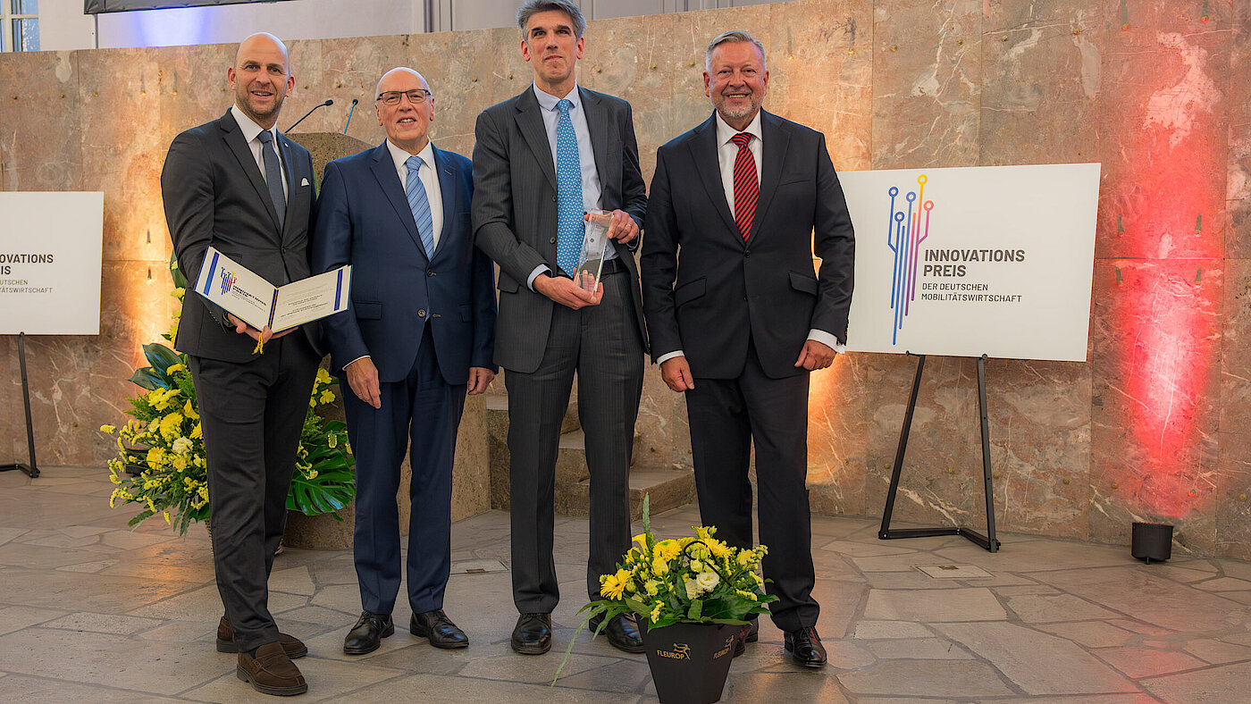 Mit dem Innovationspreis der deutschen Mobilitätswirtschaft zeichnete die Deutsche Verkehrswissenschaftliche Gesellschaft (DVWG) e.V. in diesem Jahr die EDGITAL GmbH aus – ein junges, 100-prozentiges Spin-off des Essener Baukonzerns HOCHTIEF. Das Unternehmen entwickelt eine KI-gestützte Plattform zur digitalen Straßenerhaltung, die Städten und Kommunen hilft, ihre Infrastruktur effizienter, nachhaltiger und datenbasiert zu managen. Der Juryvorsitzende Prof. Knut Ringat, DVWG-Präsident Prof. Jan Ninnemann sowie Laudator Regierungspräsident Prof. Jan Hilligardt übergaben den Preis an Maximilian Brand, Geschäftsführer der EDGITAL GmbH. Eine hochkarätige Jury aus Expertinnen und Experten der Verkehrsbranche hatte das Projekt unter 33 Bewerbungen zum Sieger gekürt. Der Innovationspreis der deutschen Mobilitätswirtschaft fand in diesem Jahr bereits zum fünften Mal statt, traditionell am Vorabend des Deutschen Mobilitätskongresses.